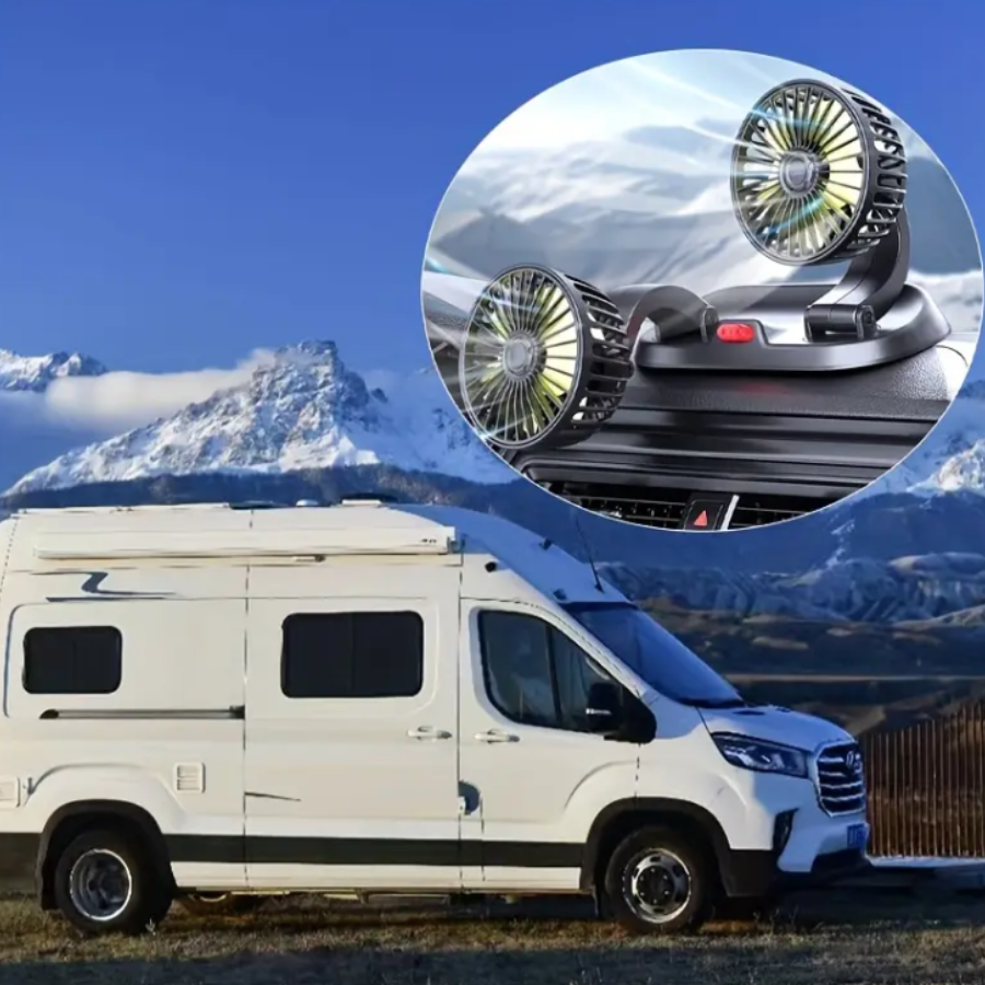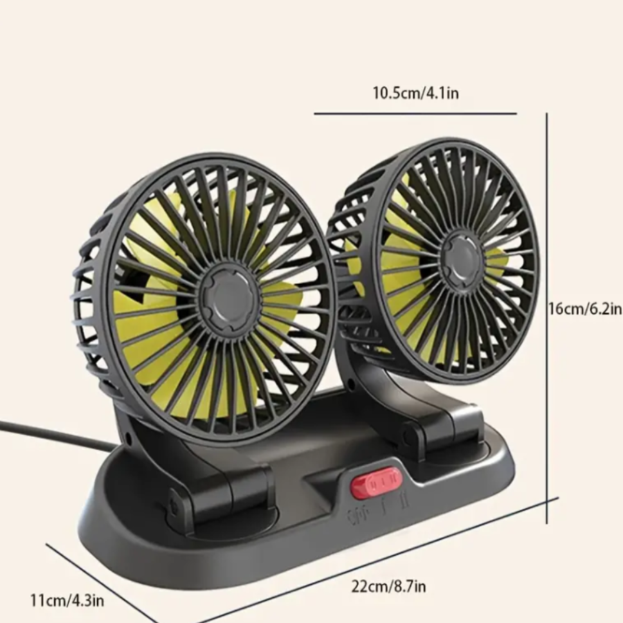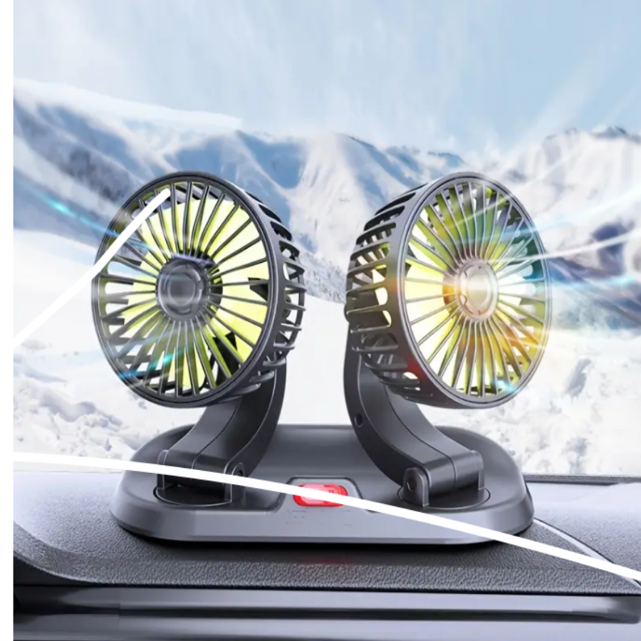 Este ventilador de refrigeración de automóvil con 2 cabezales de ventilador giratorios, los 2 cabezales pueden girar 360° y girar manualmente en cualquier dirección. Puede proporcionar un fuerte viento para enfriar a los pasajeros del asiento trasero y las mascotas en el asiento trasero inmediatamente cuando el aire acondicionado del automóvil es débil o no tiene aire acondicionado.