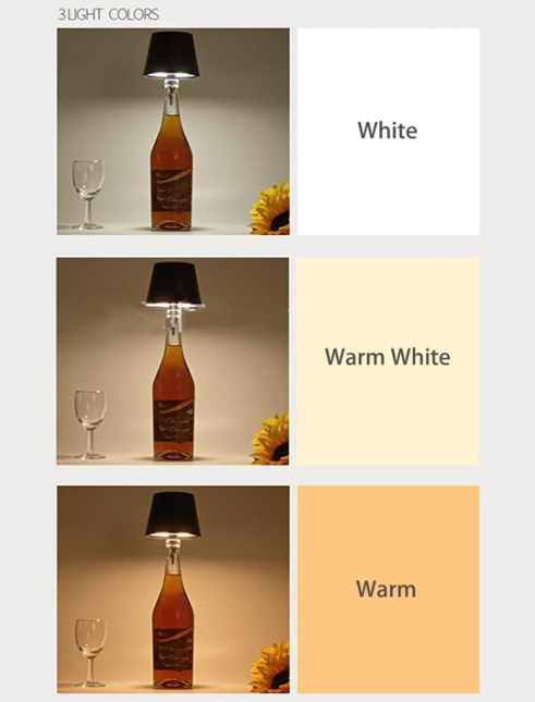 - Atenuación táctil: la lámpara LED para botella cuenta con un interruptor táctil que te permite encender la luz intuitivamente, apagarla y atenuarla con solo un dedo. Pulsa brevemente para elegir entre tres colores claros (cálido, natural y blanco), y pulsa durante mucho tiempo para ajustar el brillo (5%-100%).